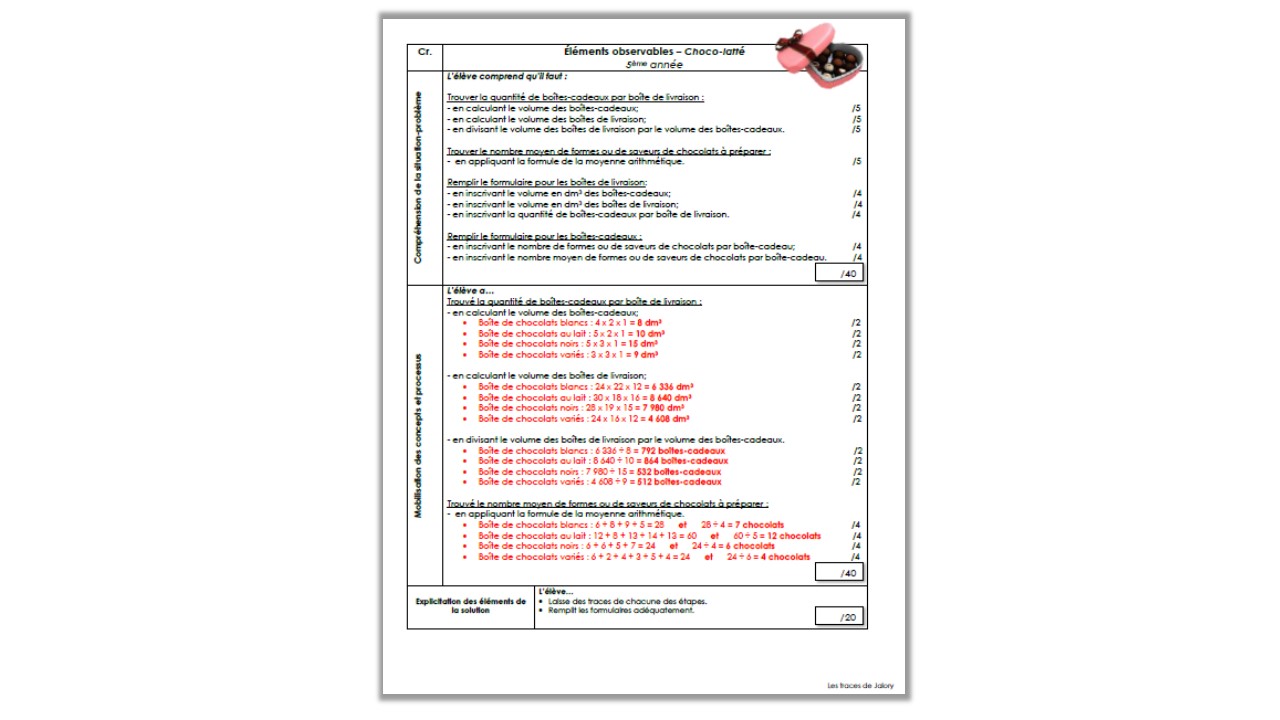 Cette évaluation porte sur le volume, la moyenne et la division.  Elle contient une mise en situation, un cahier de l’élève et une grille pondérée avec éléments observables.  Elle s’adresse aux élèves de 5e année du primaire.