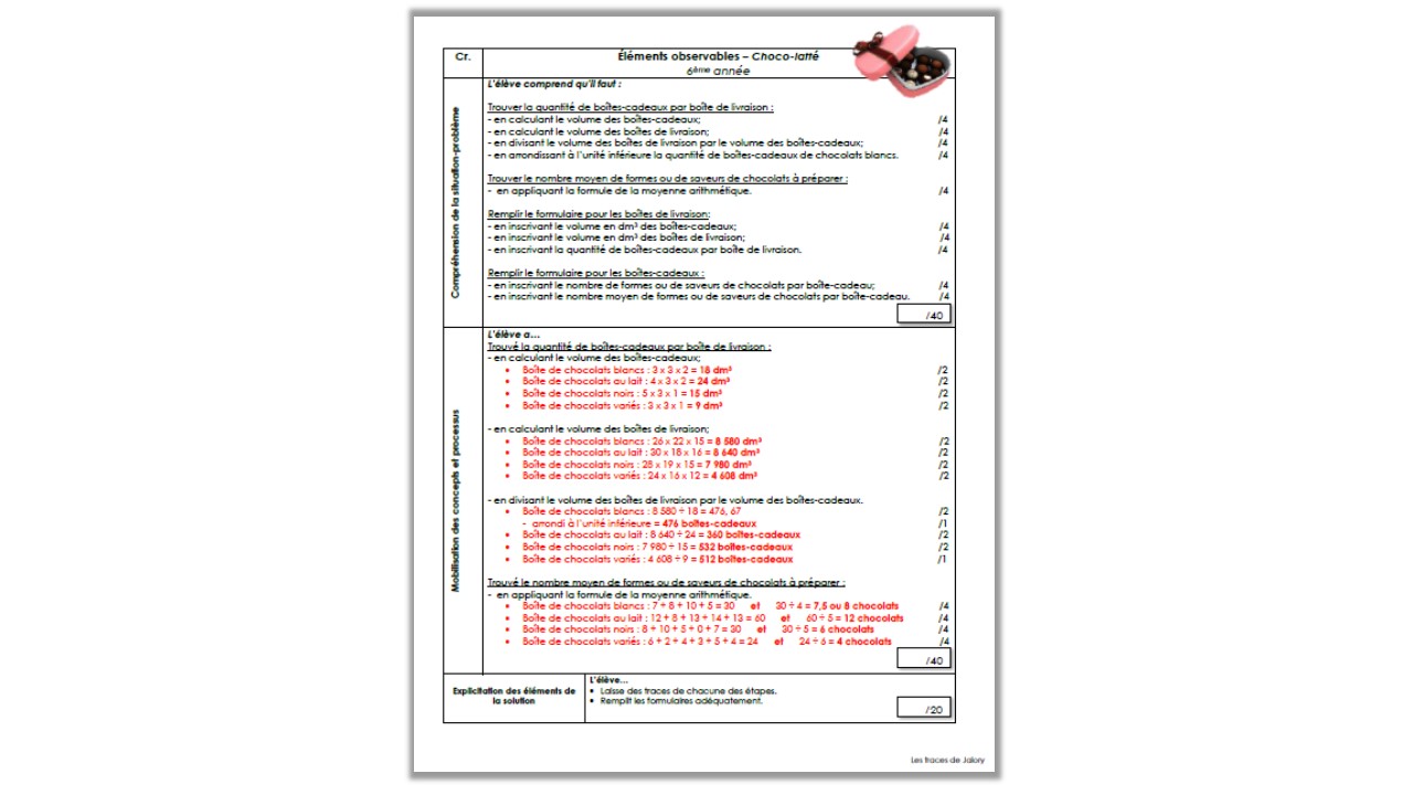 Cette évaluation porte sur le volume, la moyenne et la division. Elle contient une mise en situation, un cahier de l’élève et une grille d’évaluation pondérée avec éléments observables. Elle s’adresse aux élèves de 6e année du primaire.