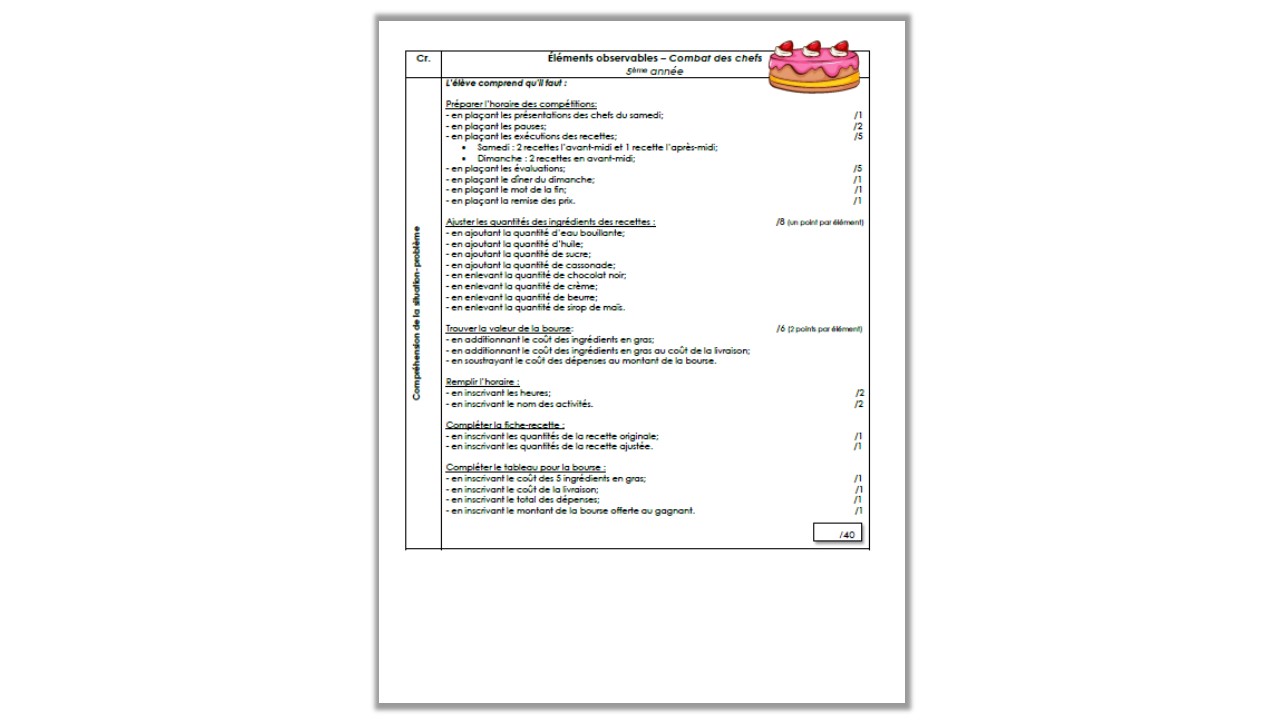 Cette évaluation porte sur la durée, l’addition et la soustraction de fractions, l’addition et la soustraction de nombres décimaux. Elle contient une mise en situation, un cahier de l’élève et une grille d’évaluation pondérée avec éléments observables. Elle s’adresse aux élèves de 5e année du primaire.