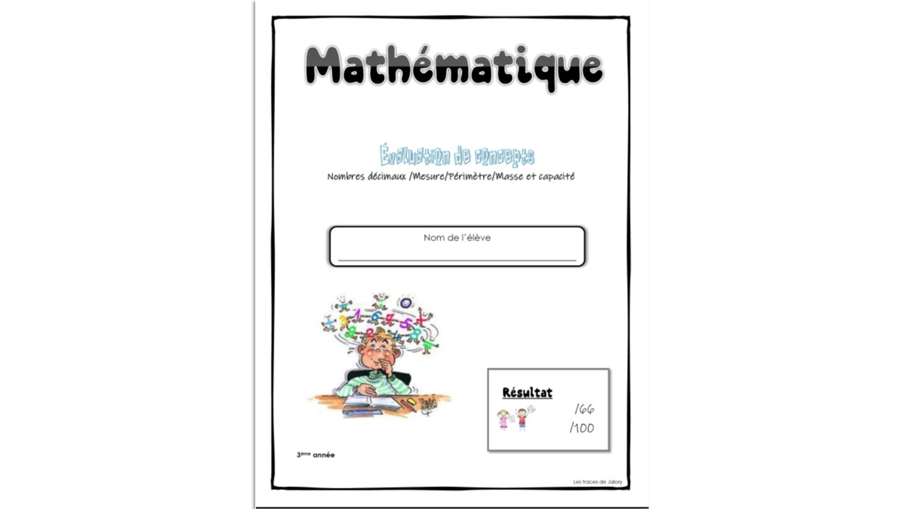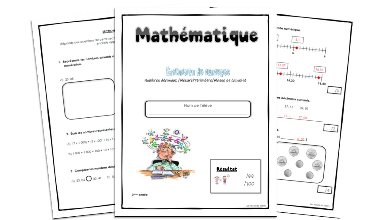 Cette évaluation porte sur les nombres décimaux, la mesure, le périmètre, la masse et la capacité. Elle s’adresse aux élèves de 3e année. Un corrigé vous est fourni.