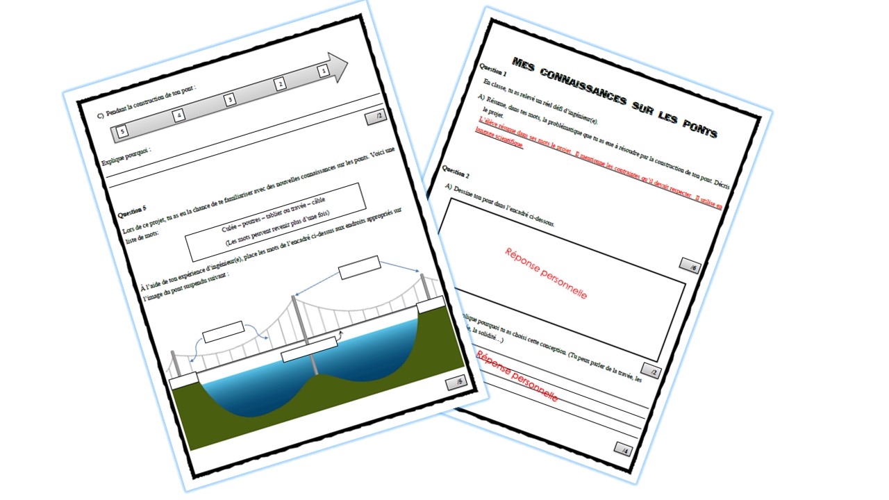 Cette évaluation porte sur la construction d’un pont. Suite à la réalisation du projet “D’une rive à l’autre” tiré du site Déclic science-techno, l’élève sera questionné sur les connaissances qu’il a acquises. Dans cette évaluation, il y a aussi une grille d’évaluation portant sur les observations faites par l’enseignant(e). Vous y retrouverez aussi un corrigé de l’évaluation. Cette évaluation s’adresse aux élèves du deuxième cycle du primaire. Il est important de noter que vous devrez vous rendre sur le site “Déclic science-techno” pour aller chercher la documentation nécessaire à la réalisation du projet.