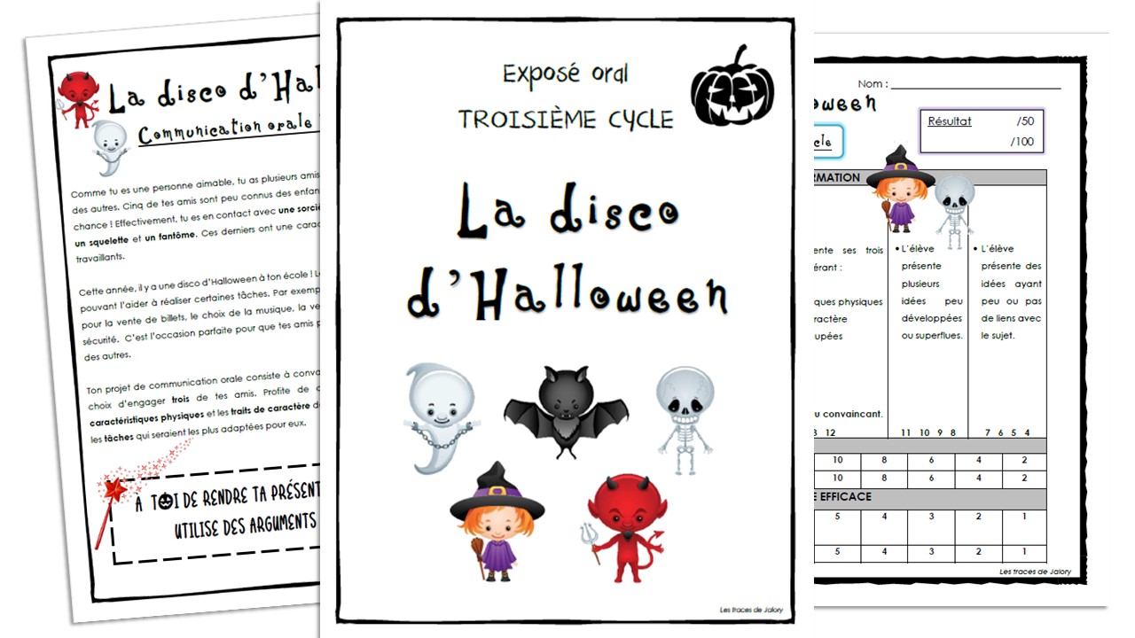 Dans cette évaluation, l’élève doit convaincre la directrice d’engager trois de ses amis pour réaliser certaines tâches à la disco d’Halloween de l’école. Pour ce faire, il doit, entre autres, nommer les caractéristiques physiques ainsi que les traits de caractère de ses amis. Un exemple d’introduction, de description d’un personnage et d’une conclusion ainsi qu’une grille d’évaluation pondérée avec éléments observables vous sont fournies.