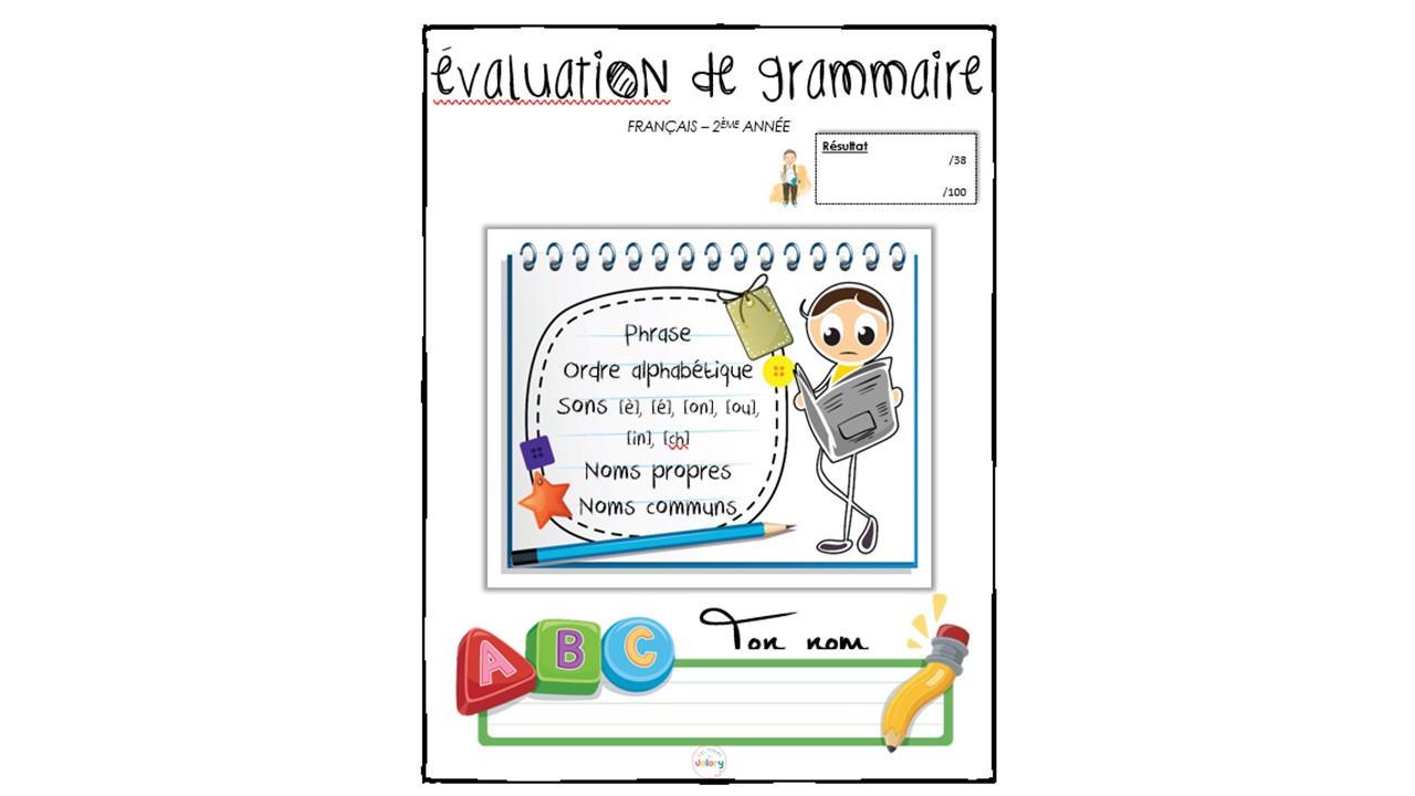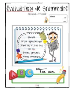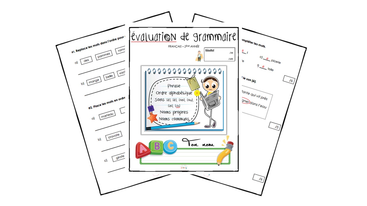 Cette évaluation porte sur la phrase, l’ordre alphabétique, les sons [è], [é], [on], [ou], [in] et [ch] ainsi que sur les noms propres et communs. Elle s’adresse aux élèves de 2e année. Un corrigé vous est fourni.