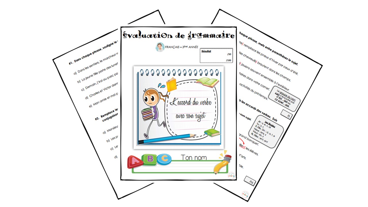 Cette évaluation porte sur la reconnaissance du verbe conjugué, le pronom de conjugaison, le sujet du verbe et l’accord du verbe avec le sujet. Elle s’adresse aux élèves de 3e année. Un corrigé vous est fourni.