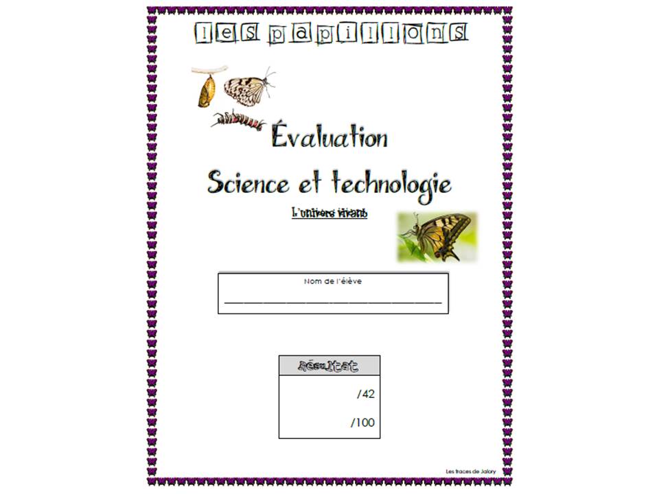 Cette évaluation porte sur le cycle de vie, l’anatomie, les fonctions des parties du corps et les habitudes de vie du papillon. L’élève sera questionné sur les connaissances qu’il a acquises. L’évaluation s’adresse aux élèves du deuxième cycle du primaire. Il est important de noter que vous devrez chercher la documentation en lien avec les connaissances de cette évaluation.