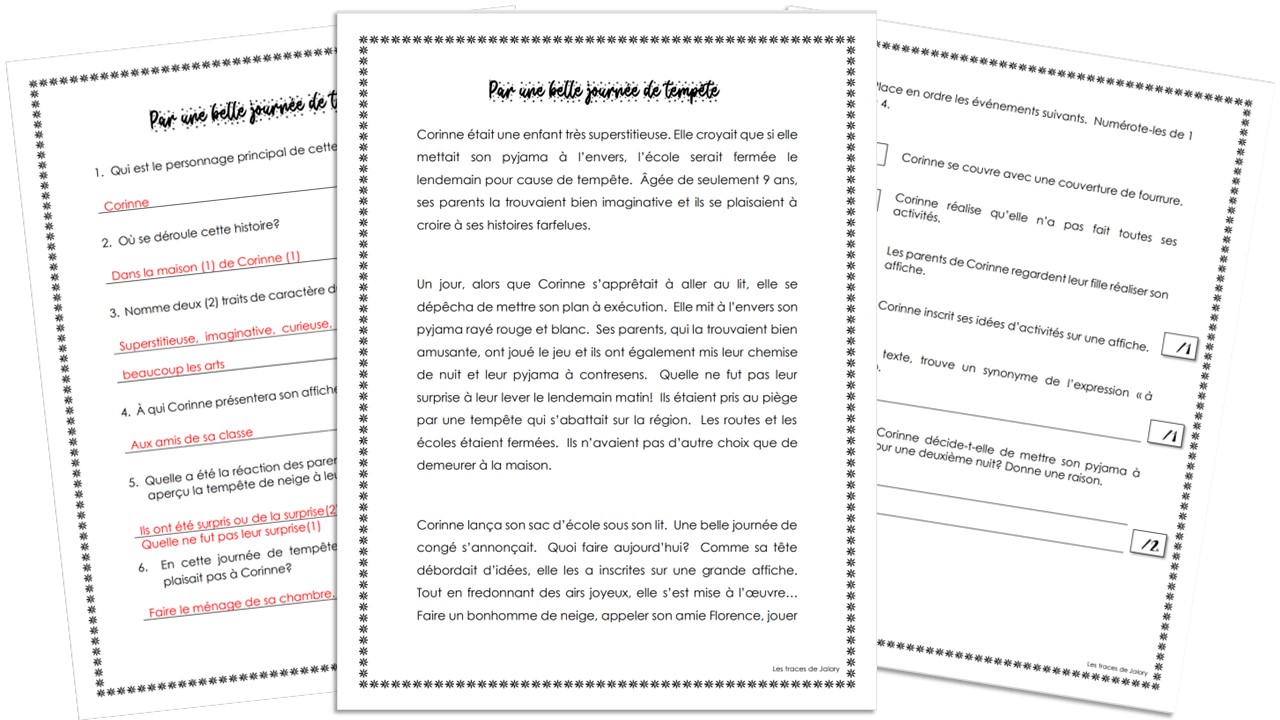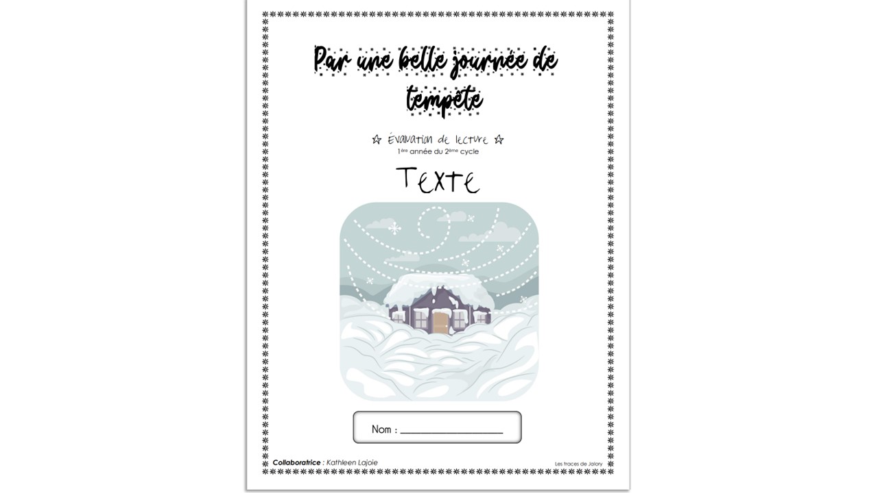 Dans cette évaluation, l’élève aura à lire un texte narratif en lien avec une journée de tempête. Il devra répondre à seize questions portant sur trois des dimensions de la lecture: compréhension, interprétation et appréciation. Elle s’adresse aux élèves de 3e année du primaire. Un texte, un questionnaire et un corrigé vous sont fournis.