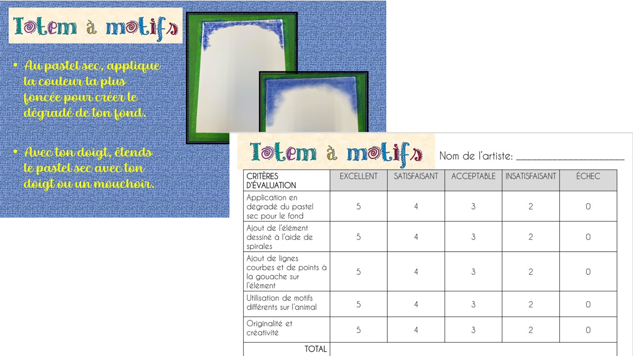 Dans ce projet d’arts plastiques, les élèves devront créer un œuvre d’art incluant leur animal totem correspondant à leur date de naissance. Le fond de l’œuvre sera créé à l’aide de pastel sec et de gouache. Sur celui-ci, sera collé le visage de chaque élève ainsi qu’une image de l’animal totem rempli de motifs variés. Pour l’enseignement et l’évaluation de ce projet, vous aurez une explication plus détaillée du projet, un PowerPoint pour vous accompagner ainsi qu’une grille d’évaluation pondérée. Ce projet s’adresse aux élèves du primaire.