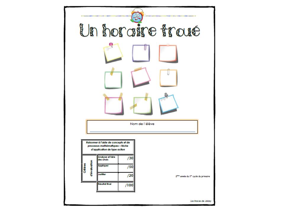Cette évaluation porte sur la mesure du temps à l’aide d’unité conventionnel en utilisant le codage de l’heure et le calcul de la durée.  Elle s’adresse aux élèves de 2e année.  Une grille d’évaluation pondérée avec éléments observables et un corrigé vous sont fournis.