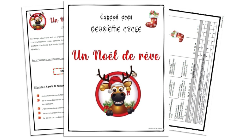 Dans cette évaluation, l’élève imagine une journée de Noël parfaite. Il doit parler des activités qu’il réaliserait, des gens qui l’accompagneraient et d’un cadeau de Noël qu’il aimerait recevoir en cette journée. Une grille d’évaluation pondérée avec éléments observables vous est fournie.
